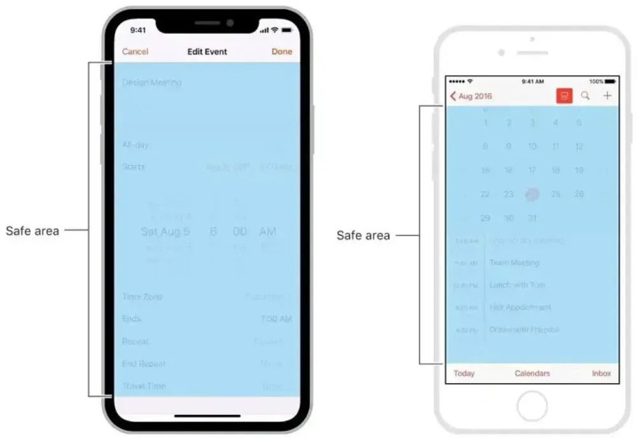 没错,它看起来就像那些年,iOS 11 引入的“安全区域”(Safe Area Insets)概念。当时有很多开发者都不明白为什么要多适配这么个流程,但直到随后发布的iPhone X 带来“刘海屏”和“小白条”(主屏幕指示条)后,才恍然大悟。